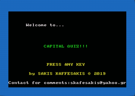 Καλώς ήρθατε στο Capital Quiz! Αυτό το παιχνίδι είναι ένα απλό παιχνίδι! Οι ερωτήσεις δείχνουν μια χώρα και εσείς επιλέγετε αυτό που πιστεύετε ότι είναι η σωστή απάντηση, την πόλη που πιστεύετε ότι είναι η πρωτεύουσα της αναφερόμενης χώρας!