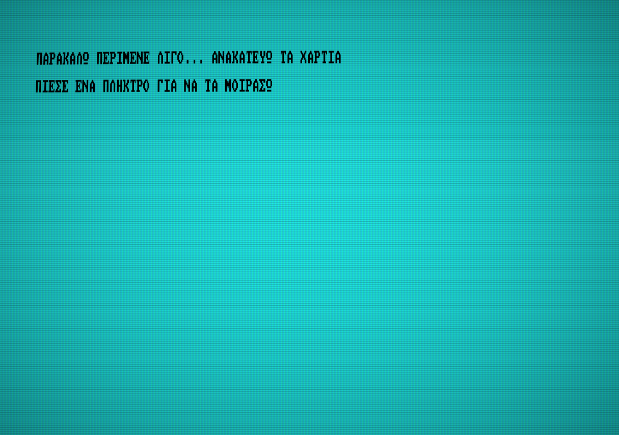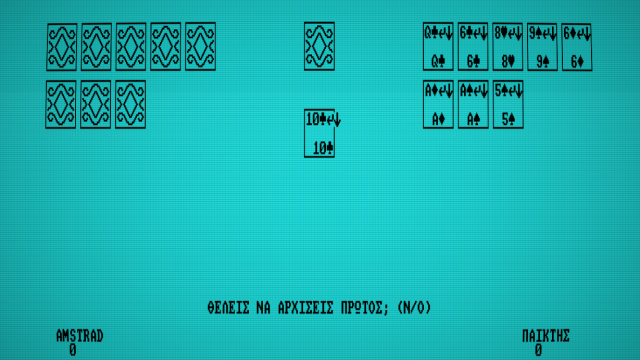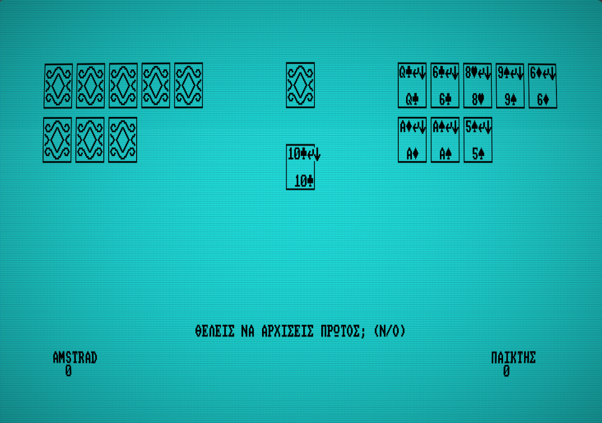 Αφού ο AMSTRAD ανακατέψει την τράπουλα μοιράζει για τον ίδιο 8 χαρτιά, για τον παίκτη 8 και ένα στη μέση. Αν βρισκόμαστε στο πρώτο παιχνίδι, τότε ο AMSTRAD θα σας ρωτήσει αν επιθυμείτε να παίξετε πρώτος, διαφορετικά, αρχίζει πρώτος ο νικητής του προηγούμενου παιχνιδιού. Μετακινώντας τον δρομέα με τα βελάκια του πληκτρολογίου ο παίκτης διαλέγει το χαρτί που θέλει να ρίξει με το SPACE BAR. Υπενθυμίζεται ότι τα χαρτιά που παίρνετε απαραίτητα να ταιριάζουν στο χρώμα ή στον αριθμό με το χαρτί που υπάρχει στο κέντρο της οθόνης, με εξαίρεση τον άσο.