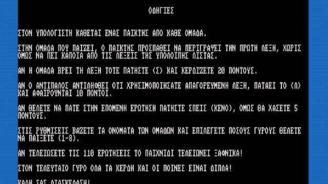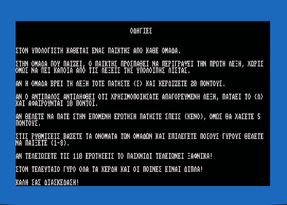 Ένας παίκτης από κάθε ομάδα κάθεται στο Άμστραντ. Ο ένας παίκτης ελέγχει το κουμπί και SPACE. Αυτός ο παίκτης προσπαθεί να περιγράψει τη λέξη στο κόκκινο πλαίσιο, χωρίς να αναφέρει τις άλλες 5 λέξεις. Αν η ομάδα βρει τη λέξη, πατάει <Σ> και η ομάδα παίρνει 20 πόντους. Εάν θεωρεί τη λέξη πολύ δύσκολη για να περιγράψει, μπορεί να πατήσει και να προχωρήσει στην επόμενη ερώτηση, αλλά η ομάδα χάνει 5 πόντους. Εάν, κατά τη διαδικασία της περιγραφής, πει μια <απαγορευμένη> λέξη (μία από τις άλλες 5 λέξεις) και τον πιάσει ο παίκτης της αντίπαλης ομάδας που κάθεται δίπλα του, ο παίκτης της αντίπαλης ομάδας πατάει <Λ> και η ομάδα χάνει 10 πόντους. Μετά παίζει η άλλη ομάδα και ολοκληρώνεται ο 1ος γύρος. Μπορείτε να επιλέξετε στις ρυθμίσεις πόσους γύρους θέλετε να παίξετε (1-8). Στον τελικό γύρο, όλοι οι πόντοι είναι διπλοί (παίρνετε 40 πόντους για σωστή απάντηση, -20 αν πιαστείτε να πείτε απαγορευμένη λέξη, και -10 για μετάβαση στην επόμενη ερώτηση. Το παιχνίδι έχει μια βάση δεδομένων με 110 ερωτήσεις. Εάν φτάσετε τον αριθμό των 110 ερωτήσεων, το παιχνίδι τελειώνει ξαφνικά και η ομάδα με την υψηλότερη βαθμολογία κερδίζει.