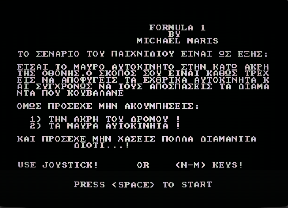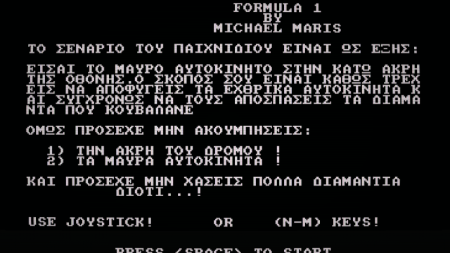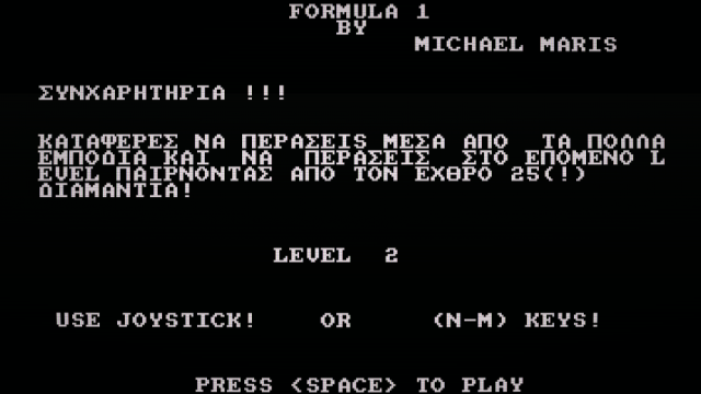 Τα κομμάτια 235 που χρειάζονται στη βόμβα, εξαρτώνται από το επίπεδο που είμαστε και είναι από 5 για το πρώτο επίπεδο έως 1 για το πέμπτο και πάνω. Σημειώνουμε ότι το FORMULA 1 τρέχει σε όλους τους Amstrad CPC και τα πλήκτρα κίνησης είναι P και Ο ή το joystick.