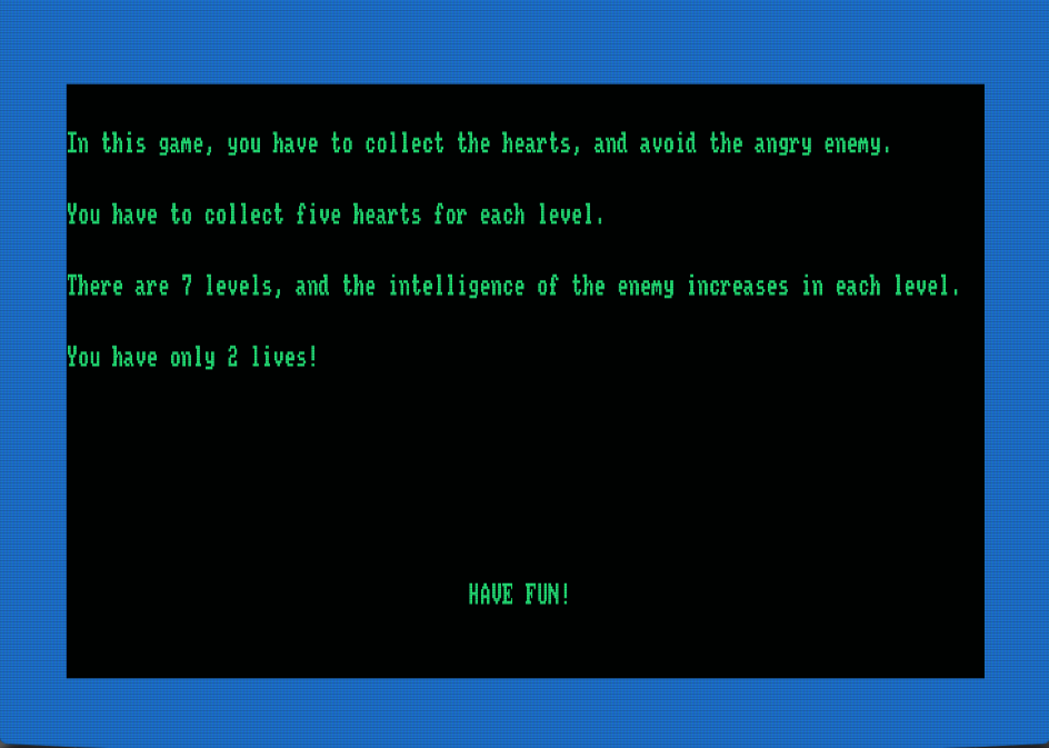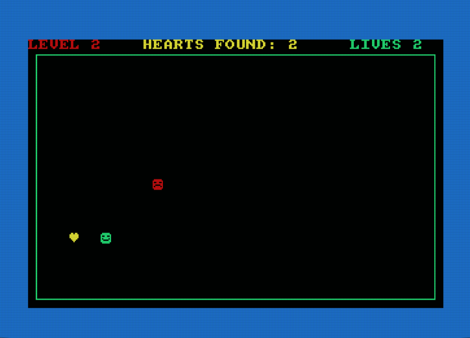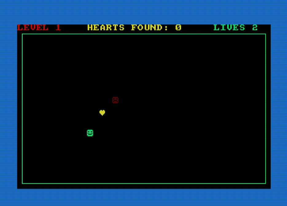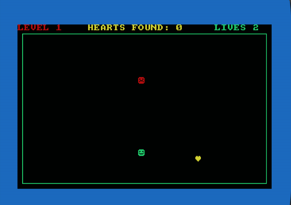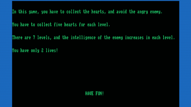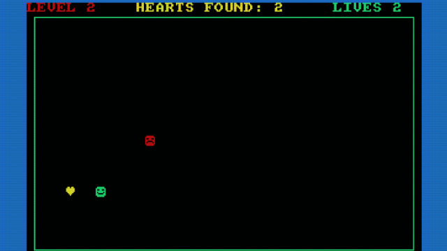 Σε αυτό το μικρό παιχνίδι, πρέπει να μαζέψεις τις καρδιές, αλλά χωρίς να σε πιάσει ο θυμωμένος εχθρός. Πρέπει να μαζέψεις 5 καρδιές για κάθε επίπεδο. Υπάρχουν 7 επίπεδα, αλλά ο εχθρός γίνεται λίγο πιο έξυπνος σε κάθε επίπεδο! Έχεις μόνο 2 ζωές!