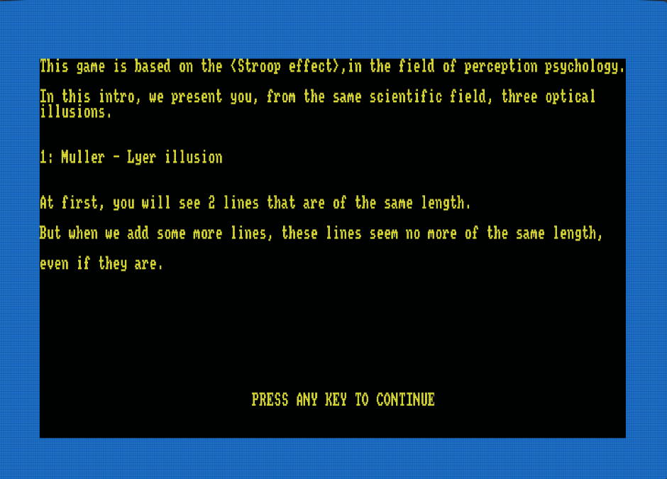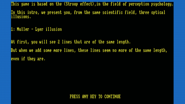 Δεδομένου ότι το φαινόμενο Stroop φαίνεται να εμφανίζεται κυρίως στη γλώσσα με την οποία είστε πιο εξοικειωμένοι (μητρική γλώσσα), το παιχνίδι είναι διαθέσιμο σε πολλές γλώσσες (αγγλικά, ελληνικά, ισπανικά, γαλλικά και γερμανικά). Η αλλαγή γλώσσας επηρεάζει μόνο τις λέξεις των τεστ και όχι ολόκληρο το παιχνίδι (οδηγίες, άλλες ενότητες κ.λπ.). Αυτό το παιχνίδι είναι ένα απλό παιχνίδι. Βλέπετε ένα χρώμα ή ένα σχήμα ή και τα δύο και πρέπει να επιλέξετε τη σωστή επιλογή μεταξύ 3 επιλογών. Το παιχνίδι αποτελείται από 3 επίπεδα. Κάθε επίπεδο αποτελείται από 6 τεστ και κάθε τεστ αποτελείται από 10 ερωτήσεις. Αυτό σημαίνει ότι για να ολοκληρώσετε το παιχνίδι πρέπει να απαντήσετε σε 180 ερωτήσεις.