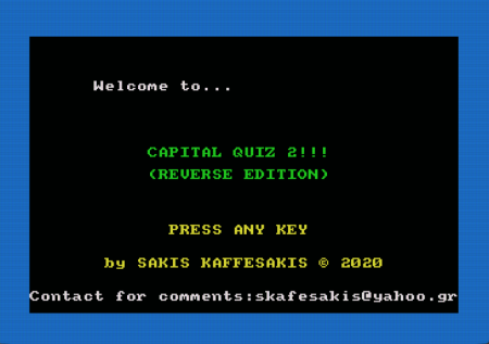 Καλώς ήρθατε στο Capital Quiz 2 (Αντίστροφη έκδοση)! Στο Capital Quiz 2 (Αντίστροφη έκδοση), σας δίνεται μια πρωτεύουσα και πρέπει να επιλέξετε μια χώρα από τρεις απαντήσεις, της οποίας η πρωτεύουσα είναι η πόλη που σας δόθηκε.